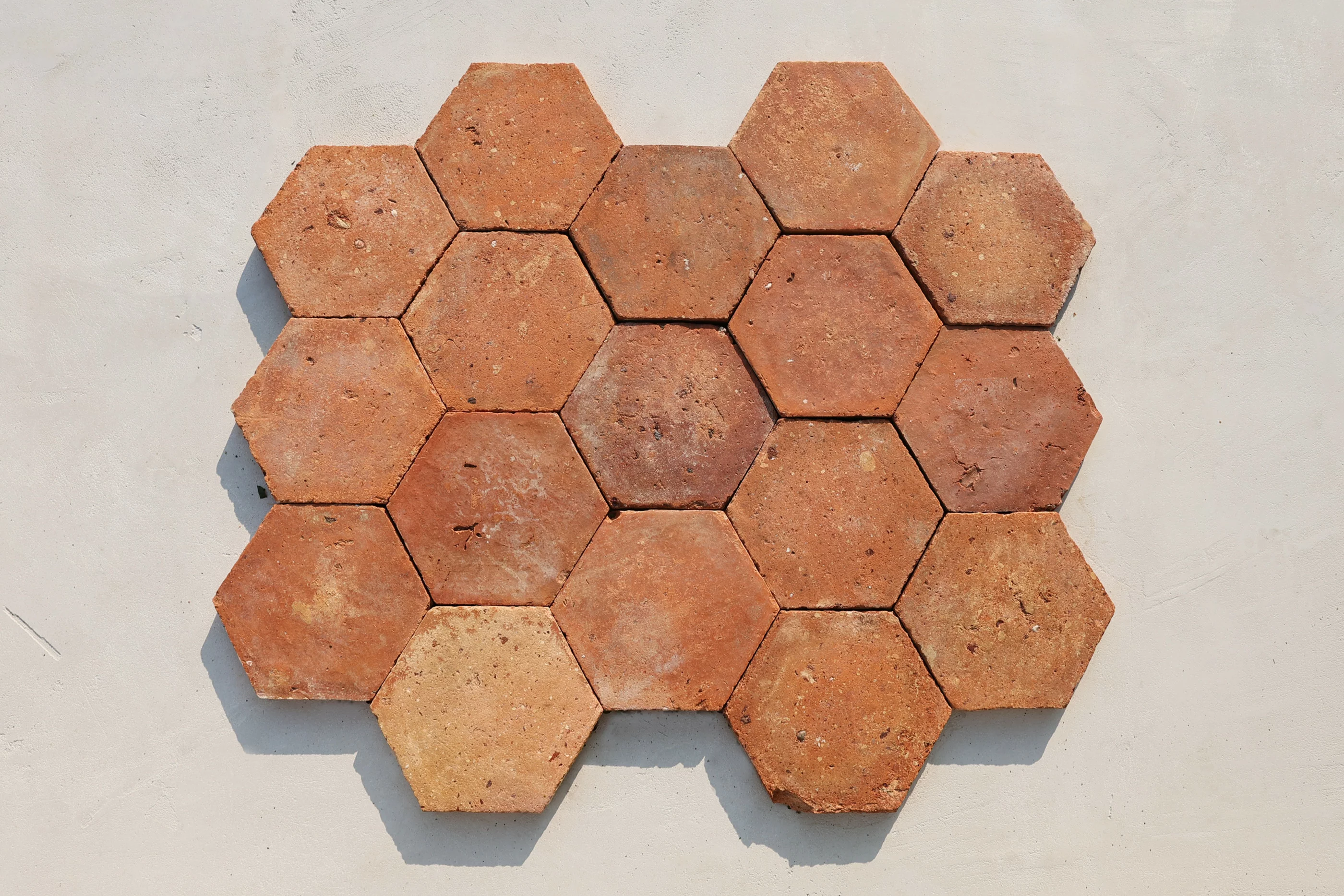 Very nice hexagonal tiles in a salmon/orange color scheme. The shape of the floor tile makes this floor look different.