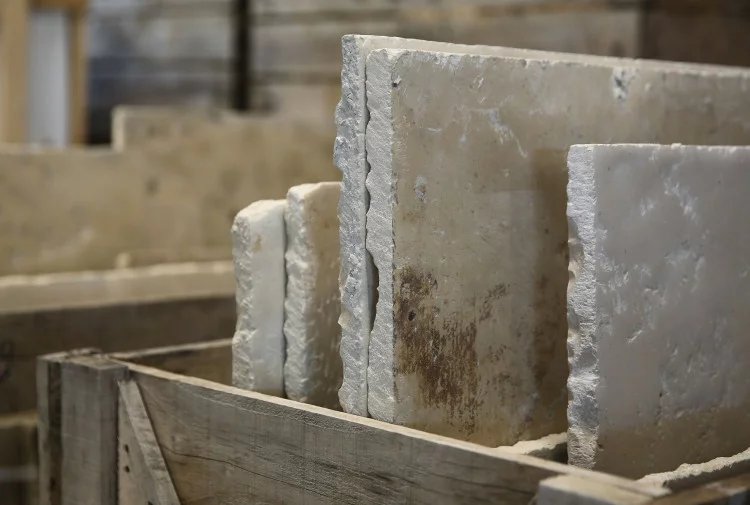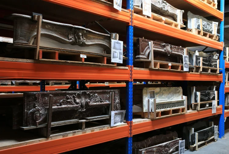 We would like to give you a look at our new warehouse so that you get a good impression of our storage capacities and products. Our spacious warehouse has a surface area of 2,600 m2. Here we store all our stock products such as antique fireplaces, natural stone floors and terracotta floors. We also offer the service to our customers to store products until they have to be delivered. We also have a large stock of old brick stones. These are on our outside area and can be viewed by appointment.